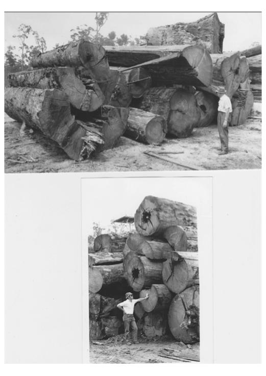 Old growth marri chiplogs (‘waste’) at the WA Chip & Pulp (WACAP) chipmill near Manjimup 1979